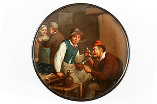 Runde Dose mit Interieurszene. Im Vordergrund zwei Männer mit Weinkrug beim Pfeiferauchen am Tisch. Im Hintergrund ein weiterer Mann beim Ankleiden einer jungen Frau. Malerei nach einer Vorlage von Adriaen van Ostade (1610-1684).