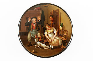 Runde Dose mit humorvoller Darstellung. Interieurszene mit junger, auf einem Stuhl sitzender Frau, der eine Maus unter den Rock gelaufen ist. Ein Mann hebt entsetzt die Hände, ein weiterer schiebt einen Reisigbesen unter den Stuhl. Eine alte Frau blickt durch die geöffnete Tür und ein Hund setzt der Maus nach. Malerei nach einer Vorlage von David Wilkie (1785-1841).