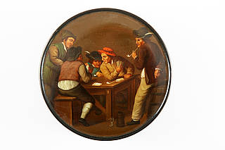 Runde Dose mit fünf niederländischen Männern beim Kartenspiel am Tisch in der Bauernstube.
