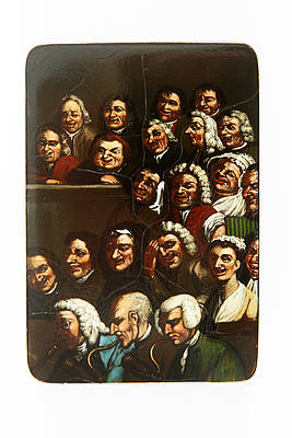 Rechteckige Dose mit zahlreichem, höhnisch lachendem Publikum im Theater- bzw. Opernparterre. Malerei nach der Radierung "The Laughing audience" von William Hogarth (1697-1764).