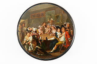 Runde Dose mit zahlreichen Personen bei wüstem Gelage in einem Bordell. Ort der Handlung ist die in London verrufene Lokalität "Rose Tavern". Malerei nach dem Kupferstich "Tom Rakewell verschwendet sein Geld" aus der Serie "Der Weg eines Liderlichen" von William Hogarth (1697-1764).