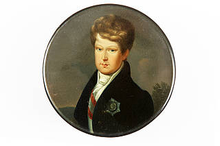 Runde Dose mit Bildnis des einzigen legitimen Sohnes Napoleons (1769-1821) und seiner zweiten Gemahlin Marie Louise von Österreich (1791-1847), Napoleon Franz Joseph Bonaparte, kaiserlicher Kronprinz von Frankreich, König von Rom (1811-1832), von 1814-1817 Prinz von Parma, ab 1818 Herzog von Reichstadt. Dargestellt mit Uniformrock mit Orden vor Landschaftshintergrund.