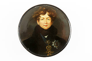 Runde Dose mit einem Bildnis des Königs Georg IV. (1762-1830) von Hannover und Großbritannien mit Halsband und Ordensschmuck mit Goldenem Vlies sowie Strumpfbandorden. Malerei nach einer Vorlage von Sir Thomas Lawrence (1769-1830). Anmerkung: Das Originalgemälde von 1822 befindet sich in der Wallace Collection in London.