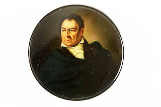 Runde Dose mit Bildnis eines vornehmen Herrn mit Halstuch und über die Schultern geworfener Pellerine. Neutraler, von rechts erhellter Hintergrund.