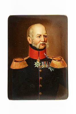 Rechteckige Dose mit Bildnis des Königs Ernst August von Hannover (1771-1851), fünfter Sohn des Königs Georg III. (1738-1820) in Militäruniform mit goldenen Epauletten und zahlreichen Orden. Neutraler, von rechts her aufgehellter Hintergrund.