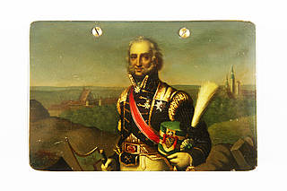 Rechteckige Dose mit Bildnis eines hochdekorierten sächsischen Landesherrn in der Festtracht der Bergleute. Der Dargestellte mit üppigem Backenbart, Degen, Schild, Gürteltasche mit gekreuzten Schlägeln, Beil in der Hand sowie Kopfbedeckung mit Federbusch im Arm in einer Landschaft mit Burganlage und Kirche.