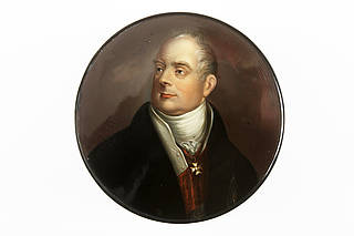 Große, runde Tabaksdose mit Bildnis König Wilhelm IV. von Großbritannien (reg. 1830-1837) mit Halstuch und Orden am Bande, Weste und dunklem Rock vor wolkigem Hintergrund.