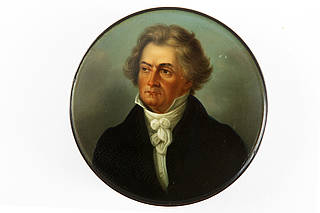 Runde Dose mit Bildnis des Komponisten Ludwig van Beethoven (1770-1827) mit Stehkragen, gebundenem Halstuch mit Schleife und dunklem Rock. Wolkiger Hintergrund.