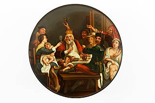 Ungewöhnlich große Tabaksdose mit vielfiguriger Darstellung. "Das Bohnenfest". Humorvolle Darstellung eines Familienfestes, bei welchem demjenigen, der beim Festmahl am Dreikönigstag (6. Januar) eine im Brot eingebackene Bohne findet, zum Bohnenkönig gekürt wird. Malerei vermutlich nach einer Vorlage von Luca Giordano (1632-1705).