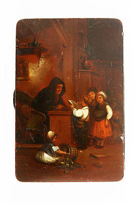Rechteckige Dose mit einem Klassenraum einer bäuerlichen Kleinkinderschule. Der alte, mit dunklem Kapuzenmantel gekleidete Lehrer auf einem Gondelstuhl am Schreibpult sitzend, läßt sich von kleinem Knaben vorlesen. Im Hintergrund die Schulklasse; im Vordergrund ein mit einem Korb spielendes Kind. Malerei nach einer Vorlage von Gerard Dou (1613-1675).