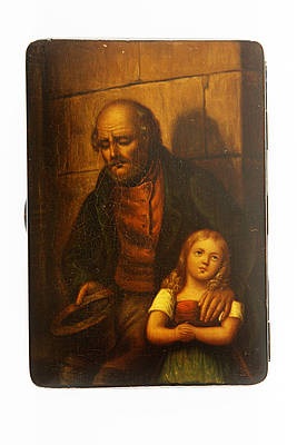 Rechteckige Dose mit altem Bettler mit Hut in der Hand und kleinem, traurig blickendem Mädchen mit gefalteten Händen vor einer Steinwand.