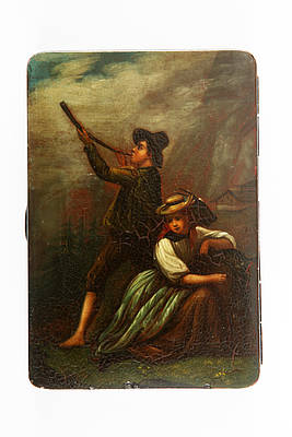 Rechteckige Dose mit einer Schäferszene in den Schweizer Bergen. Bergweide mit junger, rastender Schäferin mit Strohhut und Ziege sowie junger, barfüßiger Hirt mit Horn beim Ruf der Herde. Malerei vermutlich nach einer Vorlage von Eugène Giraud (1806-1881).