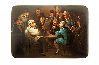 Rechteckige Dose mit einer Herrenrunde sowie zwei Knaben am Wirtshaustisch beim Politisieren und Philosophieren. Einer der Männer trägt etwas aus der Zeitung vor.