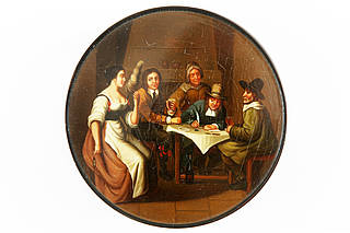 Runde Dose mit jungem Brautpaar, zwei Herren und älterer Frau beim Verhandeln des Ehervertrages am Tisch vor großem Kamin. Die junge Braut mit Wollspindel bei der Zustimmung zur Hochzeit. Malerei nach einer Vorlage von Antoine Lenain, auch le Nain (1588-1648).