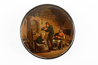 Runde Dose mit zwei niederländischen Männern und einer alten Frau beim Handarbeiten bzw. Zechen in einer Bauernkate. Malerei nach einer Vorlage von David Teniers d. J. (1610-1690).