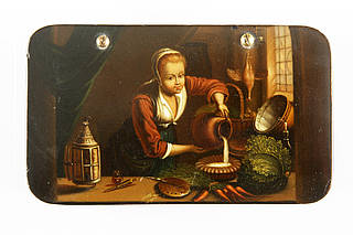 Rechteckige Dose mit stark abgerundeten Ecken. Blick durch eine Fensternische in eine Küche mit junger Niederländerin, die Milch aus einem großen Krug in eine Schale gießt. Auf dem Tisch verschiedene Gemüse, eine Laterne und weitere Utensilien. Im Hintergrund Fenster und aufgehängtes Huhn. Malerei nach einer Vorlage von Gerard Dou (1613-1675).