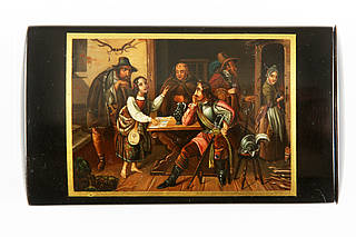 Rechteckiges Zigarrenetui mit Klappdeckel. In schmaler Goldrahmung: Versammlung verschiedener Personen am Tisch vor einem Jagdhaus. Eine junge, barfüßige Zigeunerin (Egyptienne) mit Balaleika liest einem Landsknecht mit Ritterrüstung die Karten. Der dubiose Begleiter der jungen Frau macht der Haustochter oder Magd indessen Avancen.