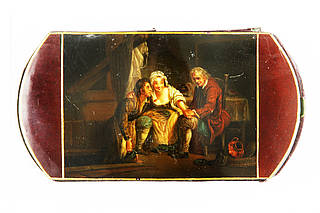 Rechteckiges Brillenetui mit abgerundeten Seitenflächen. In schmaler Goldrahmung: Junges Liebespaar und alter, niedergeschlagener, betrunkener Ehemann in einer Dachkammer.