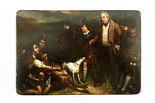 Rechteckige Dose mit schottischen Jägern, Jagdgehilfen mit Jagdhund und erlegtem Hirsch. Im Hintergrund Berglandschaft mit fliehendem Wild.