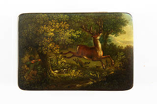 Rechteckige Dose mit von Jagdhunden gehetztem Hirsch im Wald. Links hinter einem Baumstamm ein schießender Jäger mit Jagdgewehr. Malerei nach einer Vorlage von Johann Elias Ridinger (1698-1767).