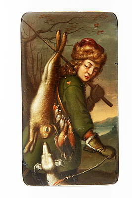 Rechteckige Dose mit von der Jagd heimkehrendem, jungen Jäger mit Pelzmütze, Jagdhund und über die Schulter gelegtem Stab mit erlegtem Hasen und totem Geflügel. Im Hintergrund Herbstlandschaft mit Bergsee.