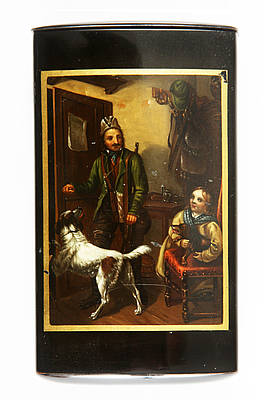 Rechteckiges Zigarrenetui mit Interieurszene in einer Jagdkammer. In schmaler Goldrahmung: Jäger mit geschecktem Hund beim Abschiednehmen von seiner kleinen Tochter, die einen kleinen Hund im Arm hält. An der Wand aufgehängte Flinte, Jagdtaschen und andere Jagdutensilien. Malerei nach dem Gemälde "Des Jägers Abgang zur Jagd" von Carl Friedrich Schulz, genannt "Jagdschulz" (1796-1866) aus dem Jahre 1835.