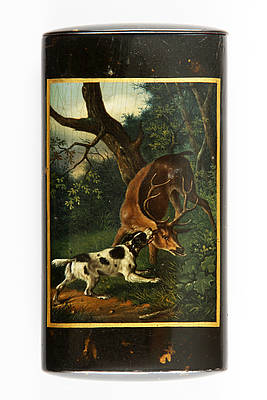 Rechteckiges Zigarrenetui. In schmaler Goldrahmung: Gescheckter Jagdhund beim Stellen eines Hirsches im Wald. Malerei im Stil des Johann Elias Ridinger (1698-1767).