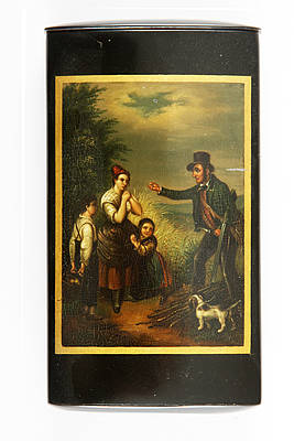 Rechteckiges Zigarrenetui. In schmaler Goldrahmung: Forstaufseher mit Hund und Gewehr am Waldrand, der junger Mutter mit zwei Kindern nach dem Sammeln im Wald die "Leviten" liest. Malerei vermutlich nach einer Vorlage von Horace Vernet (1789-1863).