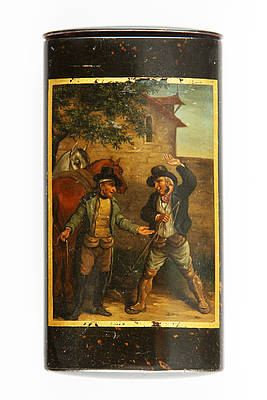 Rechteckiges Zigarrenetui mit einer Pferdehandelszene. In schmaler Goldrahmung: Zwei Roßhändler beim Einschlagen des abgeschlossenen Handels. Hinter ihnen vor einer Hausmauer zwei Pferde unter Zweigen eines Baumes.