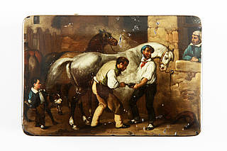 Rechteckige Dose mit zwei Schmieden beim Beschlagen eines Apfelschimmels vor der Schmiede. Am Fenster ein weiterer Mann. Hinter dem Pferd ein zusehender Knabe mit Hund.