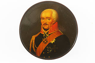 Runde Dose mit Bildnis des preußischen General-Feldmarschalls Gebhard Leberecht von Blücher, Fürst von Wahlstatt (1742-1819) in Militäruniform mit Schärpe, Halsband, Fangschnüren und verschiedenen Orden. Anmerkung: Blücher war während der Befreiungskriege, besonders nach der Völkerschlacht bei Leipzig 1813 und nach der Schlacht von Waterloo 1814, in Deutschland außerordentlich populär.