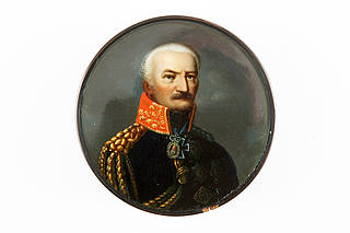 Runde Dose mit Bildnis des preußischen General-Feldmarschalls Gebhard Leberecht von Blücher, Fürst von Wahlstatt (1742-1819) in Militäruniform mit Orden und Fangschnüren.