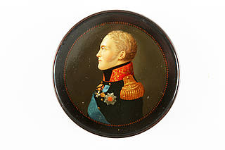Runde Dose. In gemaltem Perlrahmen: Profilbildnis Zar Alexander I. (1777-1825) in Militäruniform mit Schärpe, Epaulette und Orden. Neutraler, von hinten angeleuchteter Hintergrund.