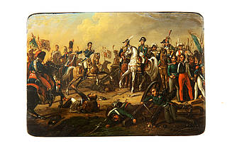 Rechteckige Dose mit einer figurenreichen Szene aus der Dreikaiserschlacht (Napoleon, Franz II. von Österreich, Zar Alexander I. von Rußland) in Austerlitz im Jahr 1805. Malerei nach einer Stichvorlage von Jean Godefroy (1771-1839) nach einem Gemälde von Pascal Baron Gerard (1770-1837). Anmerkung: Die Koalition von Österreich und Rußland gegen Frankreich wurde bei dieser Schlacht, bei der 45000 Menschen fielen, entscheidend geschlagen.
