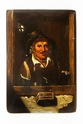 Rechteckige Dose mit Bildnis eines Schuhmachers mit Hut in der Schusterstube am geöffnetem Fenster in "trompe l`oeil"-Manier (Augentäuschung). Malerei nach einer Vorlage von Eduard Pistorius (1796-1862).
