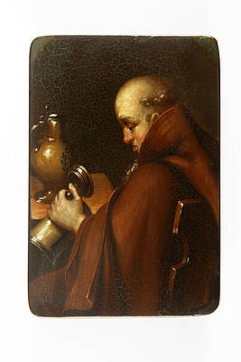 Rechteckige Dose mit einem am Tisch sitzenden Mönch mit Tonsur und Mönchskutte, der in einen geleerten Bierkrug blickt. Auf dem Tisch ein weiterer Deckelkrug. Malerei nach einer Vorlage von Karl Schorn (1803-1850).