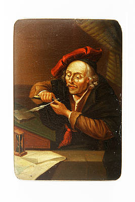 Rechteckige Dose mit einem älteren Mann mit Barrett in einer Schreibstube beim Zuspitzen eines Federkiels. Neben ihm ein Schreibpult. Vor ihm ein Fensterbrett mit Plänen und hölzerner Sanduhr. Im Hintergrund Teil eines gerafften Vorhangs. Malerei nach der Stichvorlage "Der alte Schulmeister" bzw. "Der Schreibmeister" von Albert Henry Payne nach Gerard Dou (1613-1675). Das Originalgemälde befindet sich heute in Dresden in der Gemäldegalerie "Alte Meister".