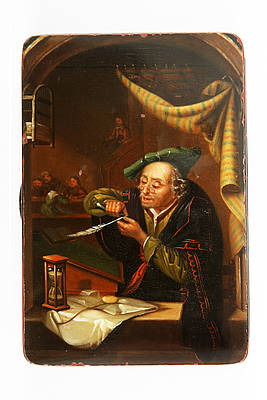 Rechteckiges Zigarrenetui mit älterem Mann mit Barrett und Samtmantel beim Anspitzen einer Schreibfeder in einer Fensternische mit Bogenabschluß. Vor ihm auf dem Fensterbrett Papierblätter und hölzerne Sanduhr. Daneben ein Schreibpult. Über ihm geraffter Vorhang. Im Hintergrund Wirtsstube mit mehreren Personen am Tisch, die von einer weiteren Person bedient werden. Im Fenstersims ein aufgehängtes Vogelbauer. Malerei nach einer Stichvorlage von Albert Henry Payne nach Gerard Dou (1613-1675).