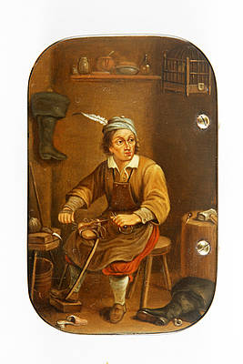 Rechteckige Dose mit stark abgerundeten Ecken. Zufriedenheit ausstrahlende Idylle mit älterem Schuhmacher bei der Arbeit in seiner Werkstatt. Im Raum verteilte Arbeitsutensilien, Stiefel und Schuh sowie an der Wand aufgehängtes Vogelbauer. Malerei nach einer Vorlage von David Teniers d. J. (1610-1690).