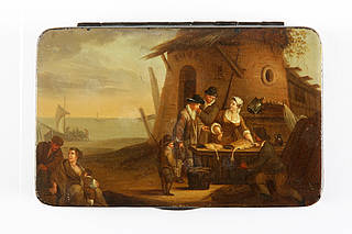 Rechteckige Dose mit einer Szene am Hafen. Eine niederländische Fischhändlerin bietet vor der Fischerhütte drei Männern mit kleinem Jungen ihren Fisch zum Kauf. Vorne links eine Fischerfamilie; im Hintergrund Fischerboot mit mehreren Personen sowie Blick auf das Meer. Malerei nach einer Vorlage von Jean Babtiste Benard (Lebensdaten unbekannt).