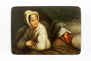Rechteckige Dose mit humorvoller Bettszene. Junge Frau mit Nachthemd und Schlafhaube blickt verächtlich auf ihren schnarchenden, älteren Mann mit Zipfelmütze in den Kissen.