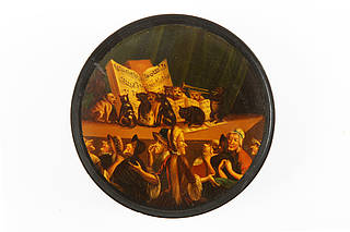 Runde Dose mit humorvoller Darstellung. Auf einem Podest vor geschlossenem Vorhang geben elf Katzen vor aufgeschlagener Partitur ein Konzert. Das Publikum, durchwegs aus älteren Frauen bestehend, rümpft entsetzt die Nasen.