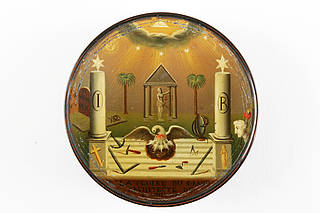Runde Dose mit zahlreichen Freimaurersymbolen auf einer Treppe. Im Zentrum ein Pelikan, der seine Jungen nährt, darüber Justizia im Tempel zwischen zwei Palmen. Am Himmel Sonne, Mond und Sterne sowie Wolkenband, durch welches das Auge Gottes seine Strahlen wirft. Unterhalb der Treppe zwei Säulen mit den Buchstaben "I" und "B" in Ovalen.