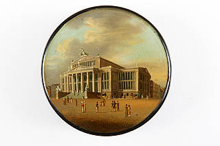 Runde Dose mit einer Ansicht des Berliner Gendarmenmarktes mit dem Neuen Schauspielhaus, erbaut von Karl Friedrich Schinkel (1781-1841). Mit Personenstaffage. Malerei nach einer Aquatinta von Friedrich Jügel (gest. 1833) nach Schinkel.