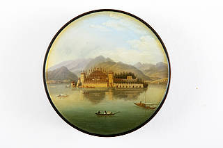 Runde Dose mit Schweizer Landschaftsdarstellung der "Großen Strasse des Simplon". Blick auf die Insel "Isola Bella" im Lago Maggiore. Im See verschiedene Boote sowie die Insel mit terrassenförmigen Bauten. Im Hintergrund Berglandschaft.