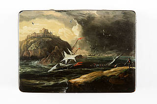 Rechteckige Dose mit einer Seesturmszene nach Claude Joseph Vernet (1714-1789). Im Vordergrund Fels mit gestrandeten Männern. In der stürmischen See gekenterte Segelschiffe sowie Rettungsboot mit zahlreichen Personen. Links im Bild auf hohem Fels eine monumentale Burganlage. Schwerer, dunkler Wolkenhimmel.