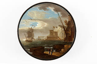 Runde Dose mit einer Hafenszene nach Claude Joseph Vernet (1714-1789). Im Vordergrund Felsküste. Im Meer aufgetakeltes Segelschiff. Rechts im Bild Burganlage, dahinter schroff aufsteigende Felsen. Wolkenhimmel mit fliegenden Seevögeln.