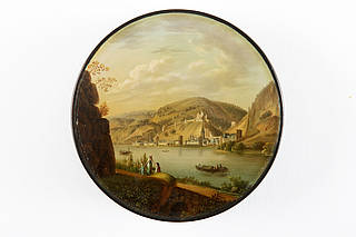 Runde Dose mit Rheinlandschaft. Blick auf Bacharach. Im Vordergrund Felsen und Uferweg mit Personentaffage. Auf dem Fluß mehrere Boote mit Personen. Am gegenüberliegenden Ufer die Stadt sowie Berglandschaft mit Burg Stahleck.