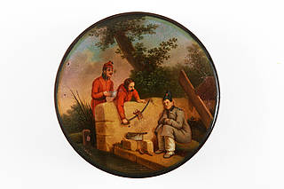 Runde Dose mit einer Soldatenszene mit zwei Soldaten, die einem dritten, armseligen Soldaten des gegnerischen Lagers etwas zu Essen und zu Trinken über eine Mauer anbieten. Landschaftshintergrund.