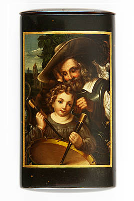 Rechteckiges Zigarrenetui mit einem älteren Mann (altdeutscher Krieger in Landsknechtuniform und großem Hut mit Straußenfeder) mit seinem Enkelsohn, der mit zwei Trommelstöcken die Trommel schlägt. Im Hintergrund Blick auf eine mittelalterliche Stadt sowie Berglandschaft.